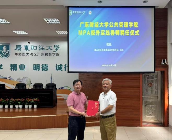 讲座开始前举行了MPA研究生校外实践导师聘任仪式,戴昌桥副院长向佛山市应急管理局原局长魏钰颁授了MPA研究生校外实践导师聘书。