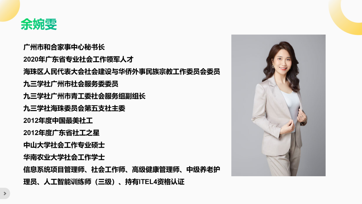 余婉雯师姐结合其从精神康复、老年服务到司法社工的跨界从业经历,重点分享了家事调解领域的创新实践。她所在的广州市和合家事中心(2016年由天河区民政局批准设立,全国首个法学专家学者型家事调解平台)创新实践"分类调解+专家攻坚""定制化贴心服务""法情理融合"三维调解机制,显著提升了复杂家事案件的调解成功率。她指出:"社会工作者的非评判视角、同理沟通技巧与系统思维,在化解家庭矛盾中具有不可替代的优势,这要求我们既要精通法律法规,更要掌握情感疏导的专业方法。"