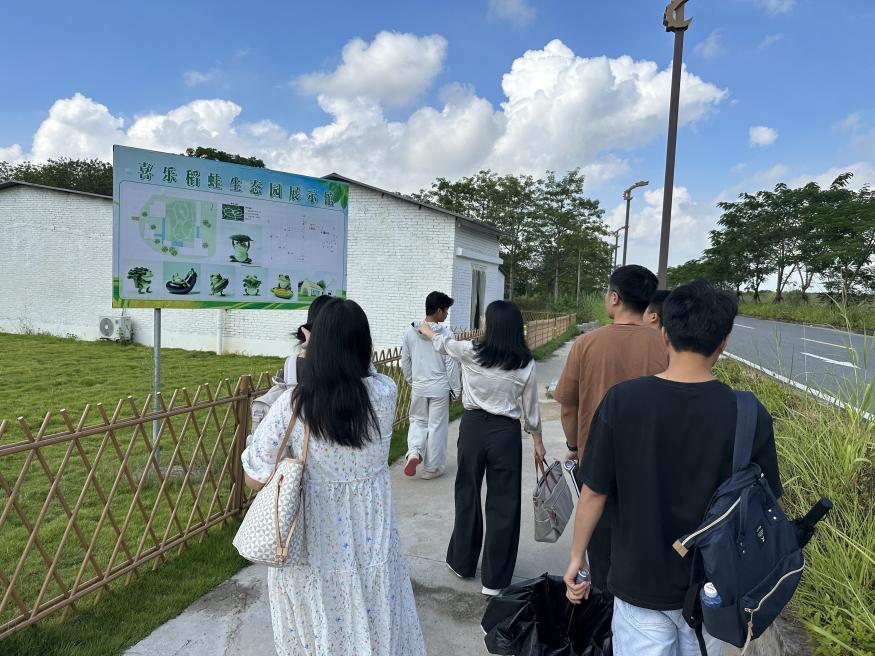 随后,调研团队走进稻田养蛙生态种养示范基地进行现场教学。镇农业农村办工作人员现场讲解了“以稻养蛙、以蛙促稻”的有机循环系统,调研团队就产业规模化发展中遇到的土地、环保、市场等实际挑战,与一线工作者进行了深入交流,从公共管理视角审视产业政策与市场机制的衔接点。